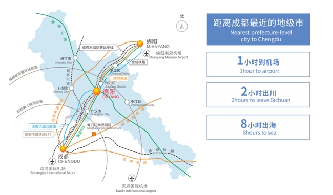 德阳,地如其名,寓意“德扬天下”“大德如阳”,幅员面积5911平方公里,辖“两区三市一县”和1个国家级经开区、1个国家级高新区。德阳位于成都东北方向,相距仅40公里,上风上水,是离成都最近的地级市。成德间动车已经实现公交化运营,每天运行100趟以上,两地通勤最快仅需23分钟。同时,世界最长的城市中轴线——天府大道已延伸至德阳,城市候机楼专线直达双流、天府国际机场、绵阳南郊机场,1小时可达到任一机场。市域铁路S11线正在加快建设,它南接成都韦家碾,北至德阳北站,在德阳有四川建院、五洲广场、德阳文庙广场等共计5个站点。“10高18快13轨”综合交通体系加快构建,成德两地如居一城。